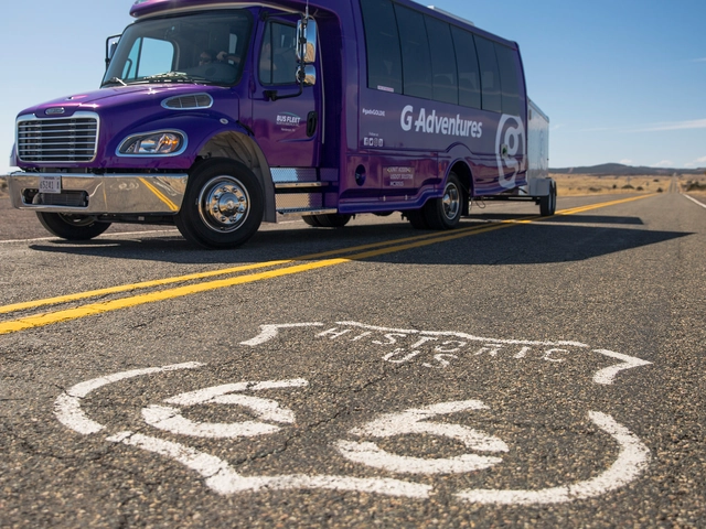 We use 25-passenger vehicles perfect for cross-country road trips on our 18-to-Thirtysomethings tours in the United States. Our new fleet of more cushy vehicles give travellers all the comfort of a big coach bus, but with a small-group experience. They put rider wellbeing first and foremost, with high-backed bucket seats and built-in headrests for all seats on board, huge 92cm-tall (36 in) windows that make every seat a window seat, an aisle way with enough headroom for most of stand upright, sliding seats that free up more shoulder room while on the road, A/C, charging stations, wi-fi, and loads of other features. We use a trailer to carry luggage and camping equipment. These are durable vehicles that allow us to drive on most types of roads in North America.