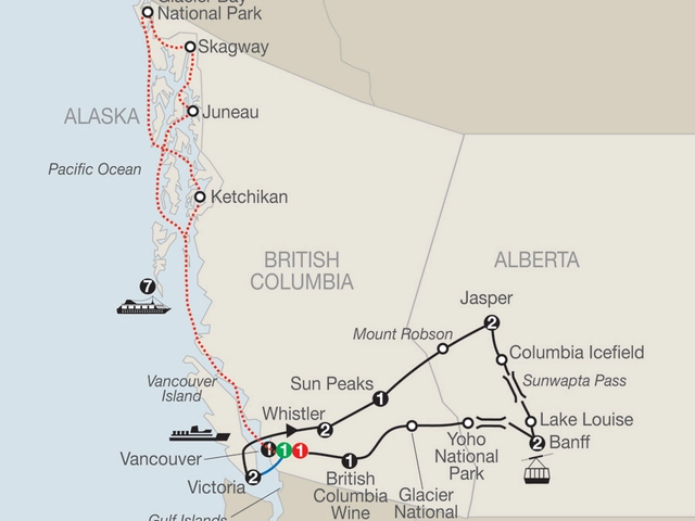 NOTES:The Canadian Rockies are blessed with stunning scenery and extraordinary outdoor attractions. Visiting and participating in activities in these locations is subject to favorable weather conditions.Cruise itineraries are provided by Holland America Line and are up to date at time of publishing. Your travel documents will contain the most current information.